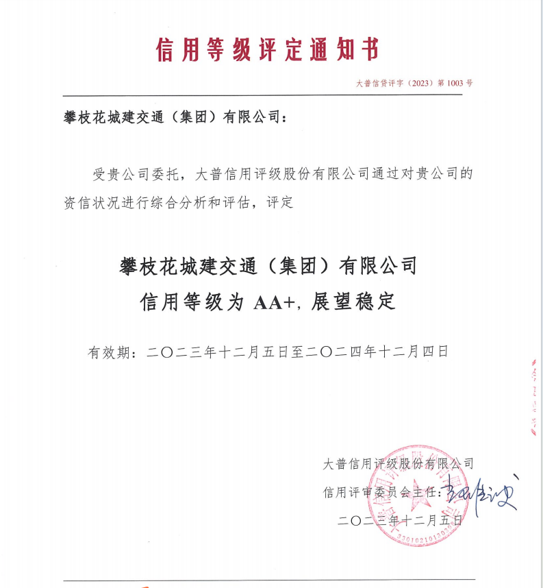 12月5日,經(jīng)大普信用評級股份有限公司綜合評定,攀枝花城建交通集團(tuán)成功獲評AA+主體信用評級,評級展望為“穩(wěn)定”。