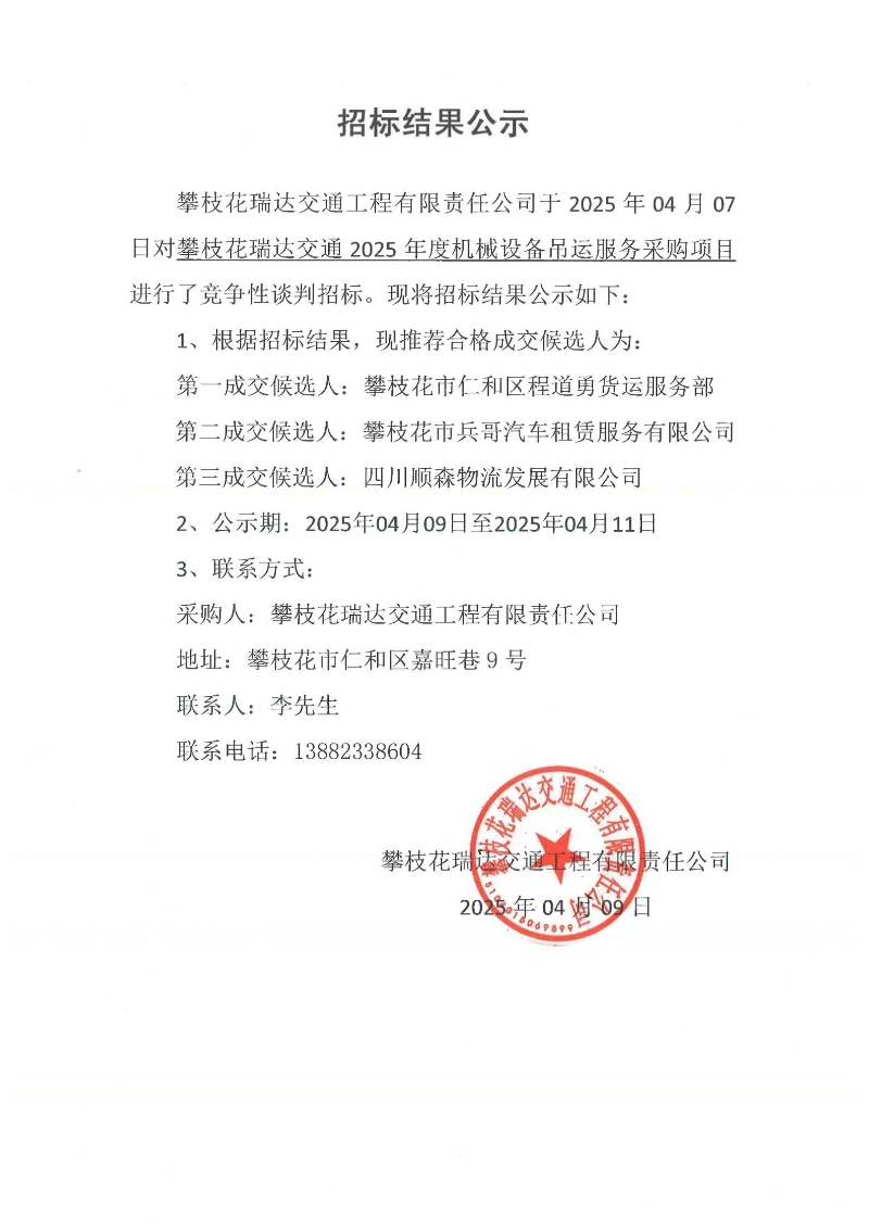 攀枝花瑞達交通2025年度機械設(shè)備吊運服務(wù)采購項目招標(biāo)結(jié)果公示