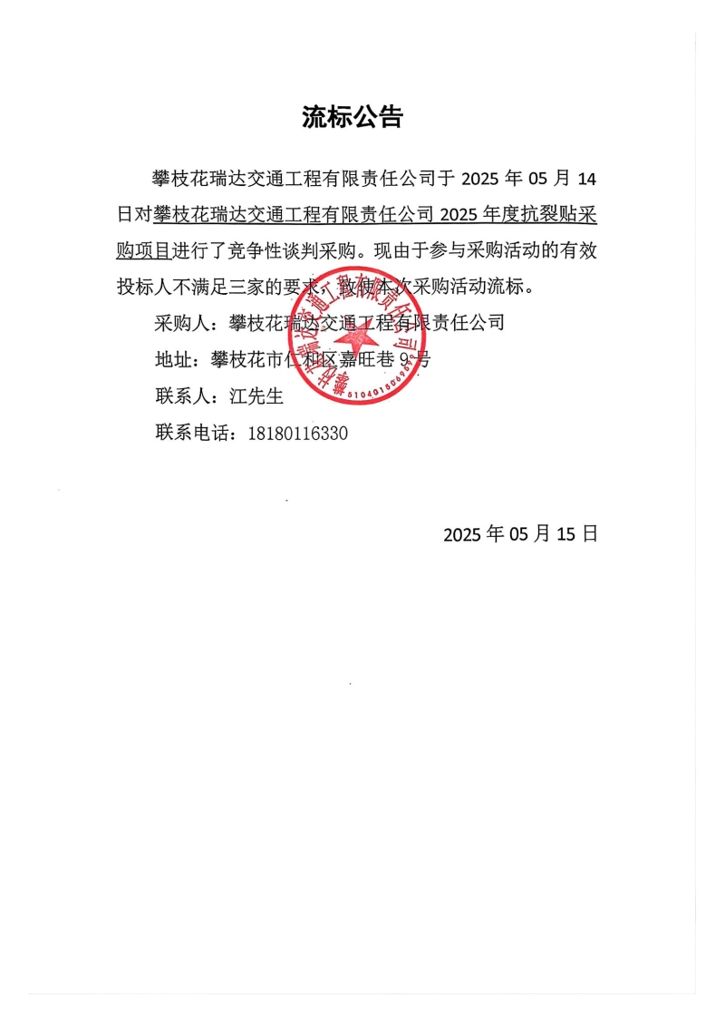 攀枝花瑞達(dá)交通工程有限責(zé)任公司2025年度抗裂貼采購項(xiàng)目競爭性談判流標(biāo)公告