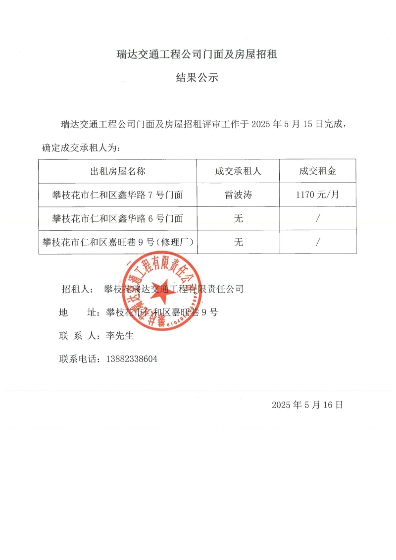 瑞達交通工程公司門面及房屋招租結(jié)果公示