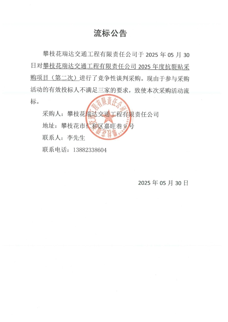攀枝花瑞達(dá)交通工程有限責(zé)任公司2025年度抗裂貼采購項(xiàng)目(第二次)競(jìng)爭(zhēng)性談判流標(biāo)公告